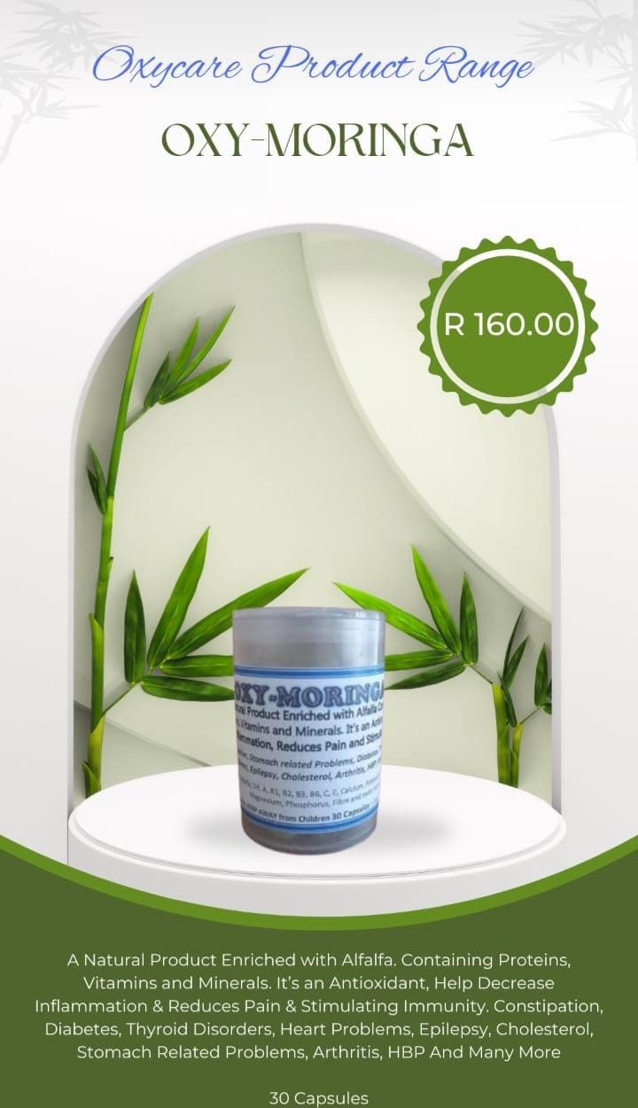 OXY-MORINGA is anĀ Natural Product Enriched with Alfalfa. Containing Proteins, Vitamins and Minerals. It’s an Antioxidant, Help Decrease Inflammation & Reduces Pain & Stimulating Immunity. Constipation, Diabetes, Thyroid Disorders, Heart Problems, Epilepsy, Cholesterol, Stomach Related Problems, Arthritis, HBP And Many More
